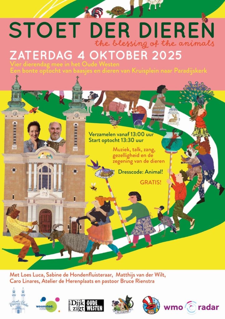 Op zaterdag 4 oktober vindt in het Oude Westen van Rotterdam voor de tweede keer de Stoet der Dieren plaats. Op Internationale Dierendag vieren dieren van allerlei vacht, schub en pluimage samen met hun baasjes, buurtgenoten en belangstellenden de wederzijdse liefde voor elkaar. Geïnspireerd op het gedachtengoed van de heilige Franciscus van Assisi (ca.1182-1226), die zich volgens de overlevering met zijn preken specifiek tot de dieren richtte, is de Paradijskerk onder leiding van pastoor Bruce Rienstra de beste plek om de dieren in het zonnetje te zetten.