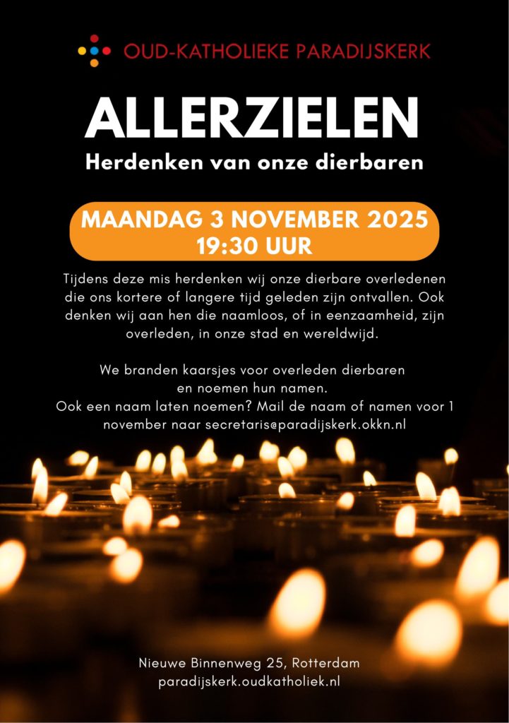 Op maandagavond 3 november is de eucharistieviering ter ere van Allerzielen om 19.30 uur. Tijdens deze mis herdenken wij onze dierbare overledenen die ons kortere of langere tijd geleden zijn ontvallen. Ook denken wij aan hen die naamloos, of in eenzaamheid, zijn overleden, in onze stad en wereldwijd.