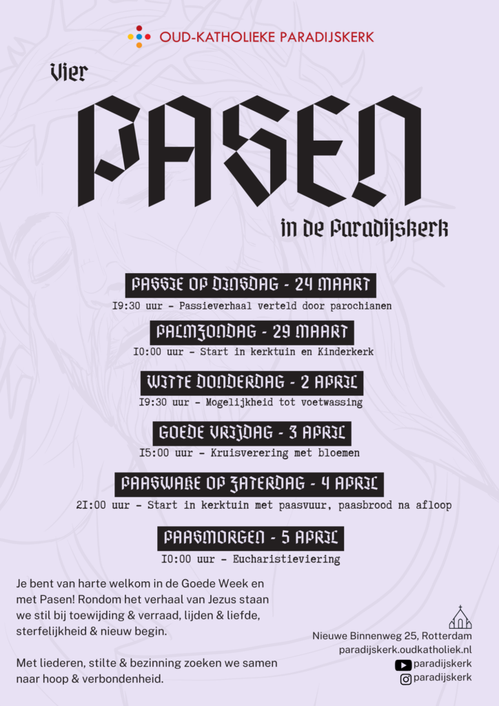 Je bent van harte welkom om in de Paradijskerk samen de Goede Week en Pasen te vieren. In deze bijzondere week volgen we het verhaal van Jezus: van zijn intocht in Jeruzalem op Palmzondag, via het Laatste Avondmaal op Witte Donderdag en de Kruisverering (waarbij je bloemen kunt meenemen) op Goede Vrijdag, naar de vreugde van Pasen met een Paaswake op zaterdagavond en een Eucharistieviering op Paasmorgen.