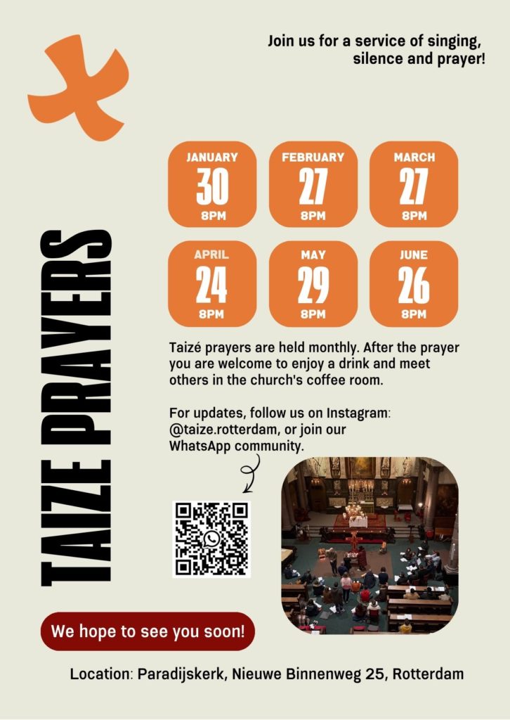Looking for a moment of peace, reflection, and connection? You are warmly invited to join our monthly Taizé prayers at the Paradijskerk in Rotterdam.